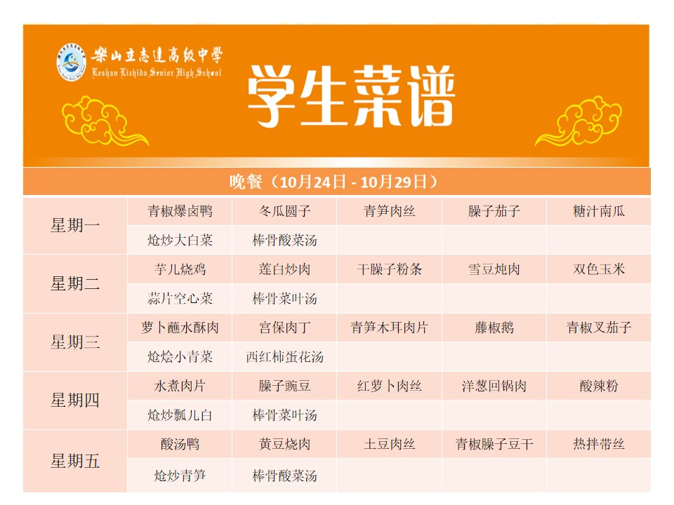 立志达高级中学菜谱(10月24日—10月29日)