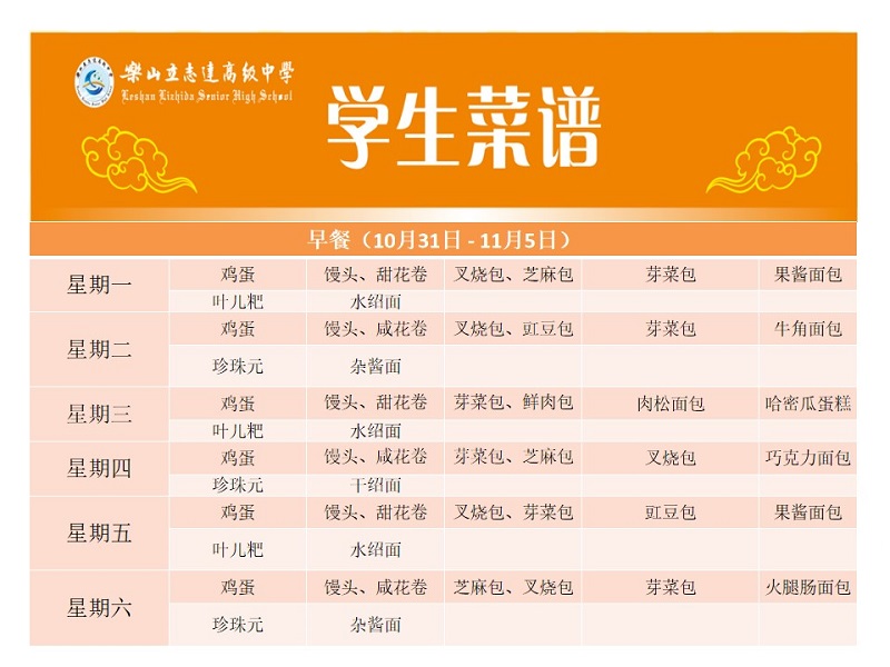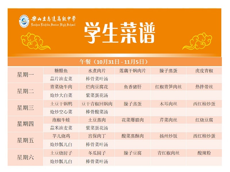 立志达高级中学菜谱(10月31日—11月5日)