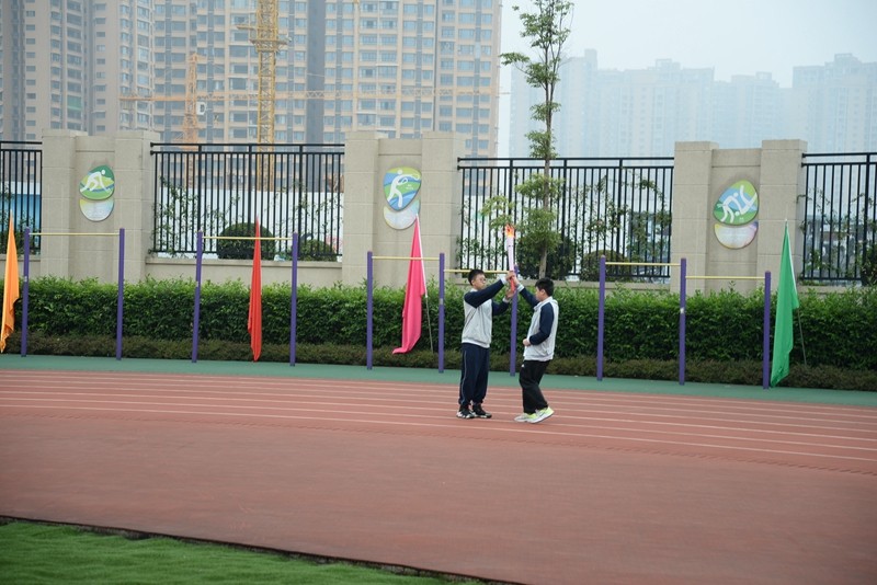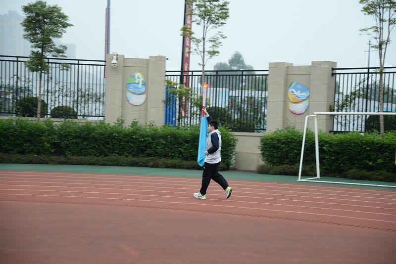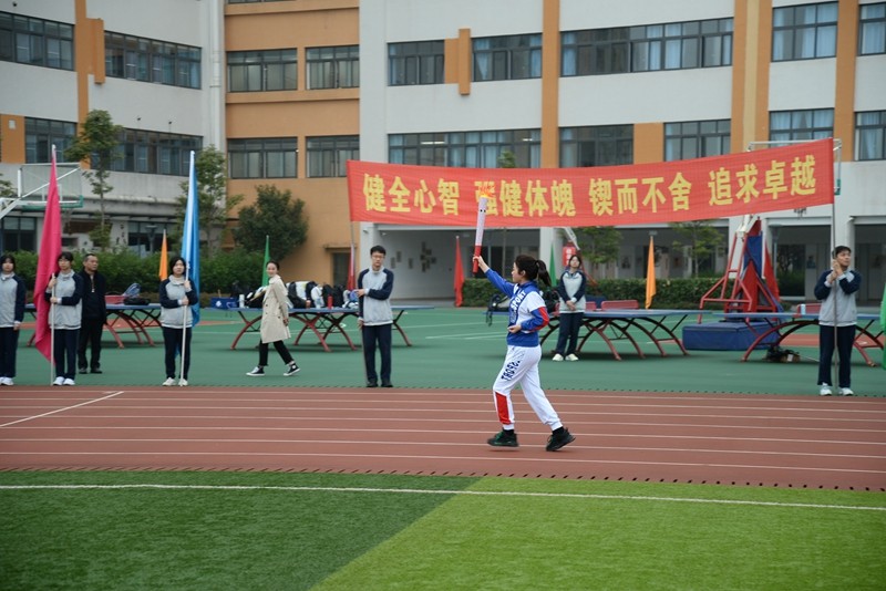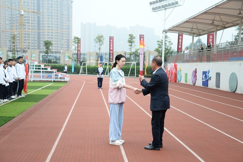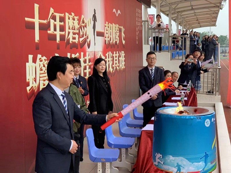 随着火炬绕场完毕,校长谢鹰接过火炬,点燃熊熊运动圣火,朗声宣布:“乐山立志达高级中学2022年田径运动会开幕式正式开启!”