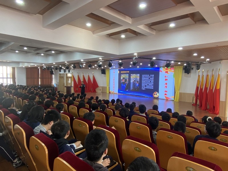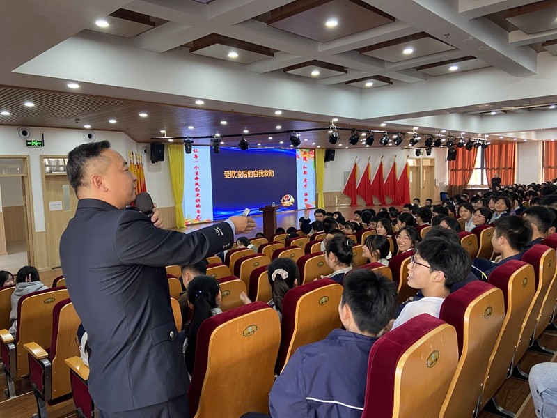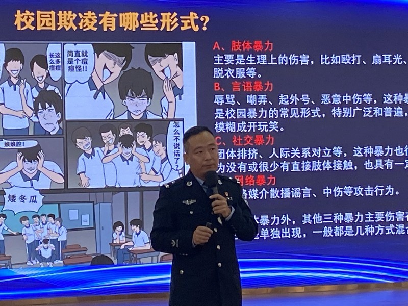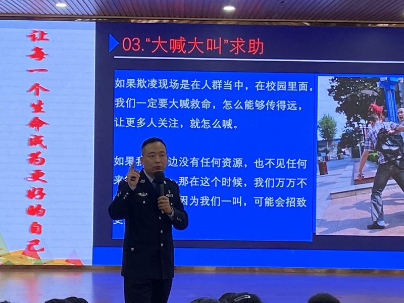接着,郭警官针对同学们在现实生活中可能会遭遇到的校园欺凌行为和“哥们儿义气”现象进行了举例,提出了预防与应对校园欺凌的方法,并向同学们强调:中学生不仅要保护好自己、防范于未然,更要在校园欺凌发生后敢于自助,不伤人,也不被人伤。