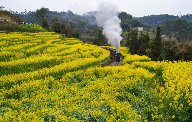 “呜……呜……”您听,这是全世界唯一仍在运营的窄轨蒸汽小火车的汽笛声。妈妈老是说“小时候啊,我每天早上都是伴着小火车的喇叭声,一路小跑上学的。”老一辈的小火车情怀让我对小火车更平添了几分好奇。小火车1958年为解决四川省最早的中英合资嘉阳煤矿运煤而生,在完成历史使命后成为了名为“工业革命活化石”的旅游观光项目。家乡人亲切的称它为“嘉阳小火车”、“工业革命的绝版景观”、“比大熊猫更珍贵的国宝”……无数的赞誉氤氲着18世纪工业时代复古的气息,而我最惬意的事莫过于坐上小火车,一趟趟穿梭在五彩四季的旅行中,浸没于金色油菜花海中,惊叹于蒸汽彩虹折射出的桐子花影,欣赏着万寿菊的怒放……初春,蒸汽从一辆辆小火车中升腾,它来自这一片热土,连接起无数小家生计与故乡经济,来自每一位满怀热爱的人。缕缕蒸汽,隆隆轰鸣,它们汇聚在一起穿越时空,环绕着这一片土地,凝聚成家乡百年的温度。“哐当、哐当!”您听到了吗?那是小火车在欢迎您的到来!