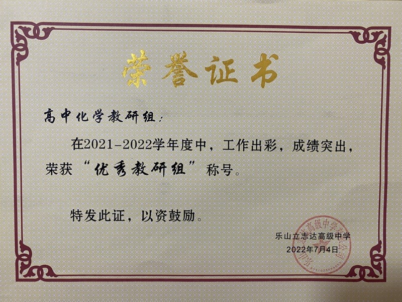 乐山立志达高级中学化学教研组全体成员在组长徐雪梅老师的带领下,戮力同心、奋力拼搏,积极探究新颖有趣的教学模式,不懈开发直观生动的教学媒介,被评为2021-2022学年度“校优秀教研组”。