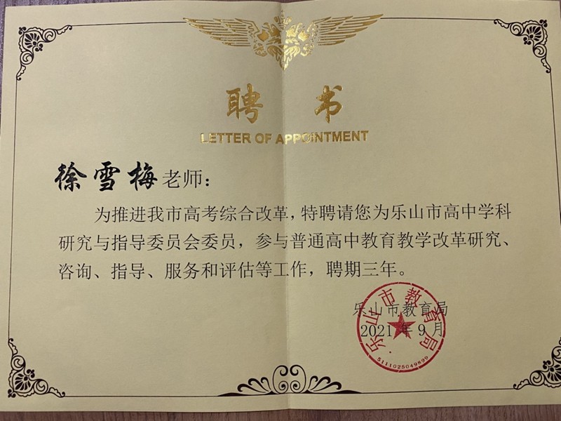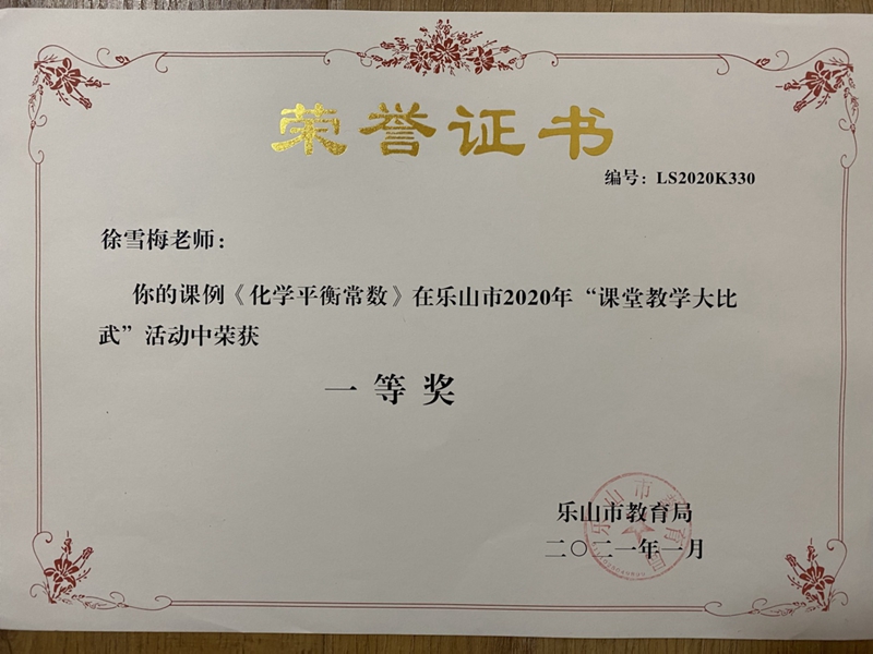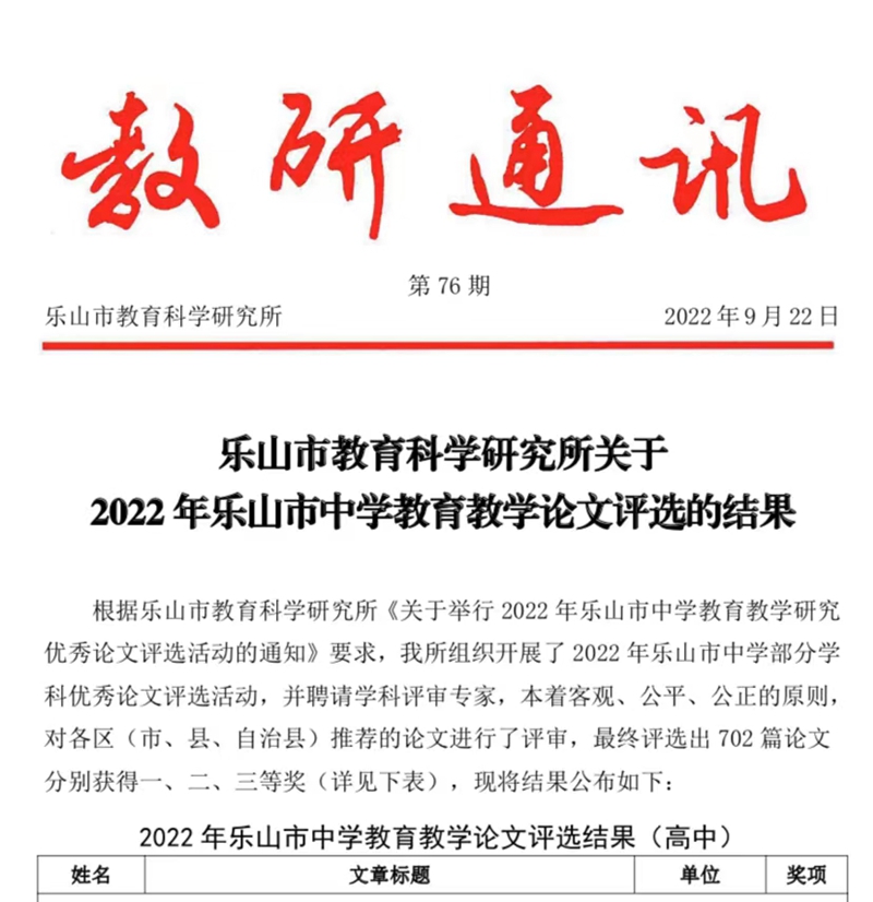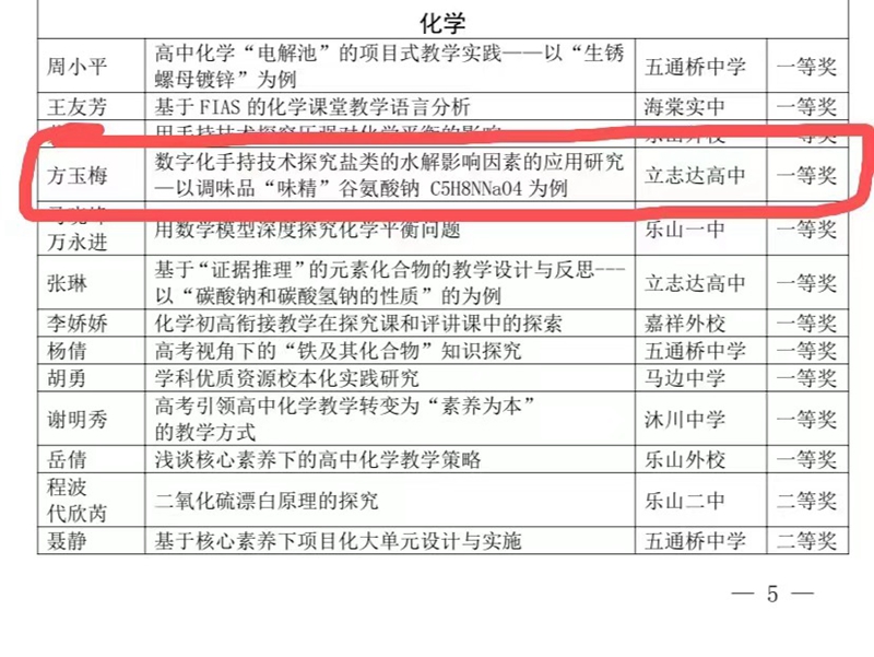 方玉梅老师着力教研,她的教育教学研究论文《数字化手持技术探究盐类的水解影响因素的应用研究》荣获四川省二等奖,乐山市一等奖的好成绩。