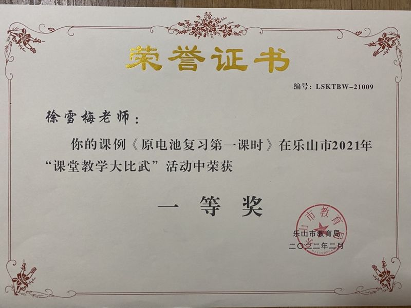 教研组长徐雪梅老师连续两年获得了乐山市课堂大比武一等奖。一轮复习《原电池》示范课目标明确,在情境中生成知识,在情境中培养学生素养。《化学平衡常数》课例转变了以往教师为主、学生为辅的教学方式,明确了核心素养,让学生做课堂的主人,是一次成功的课程改革。同时,徐老师还担任着乐山市高中学科研究与指导委员会委员工作,参与全乐山市普通高中教育教学改革研究、咨询、指导、服务和评估等工作。