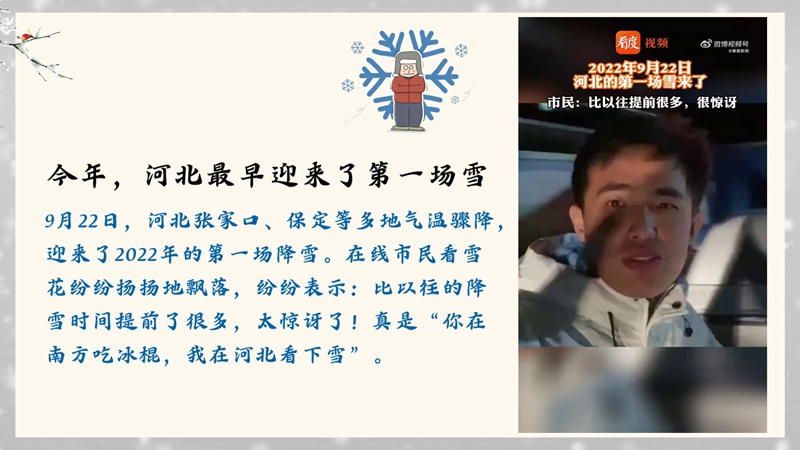有人说,轻舞飞扬小雪花是冬季的见面礼。今年,河北最早迎来了第一场雪,而南方还在“吃冰棍”。