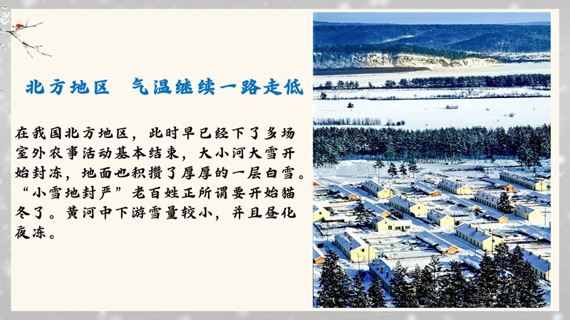 《中国天文年历》显示,北京时间2022年11月22日16点20分18秒,迎来“小雪”节气。《月令七十二候集解》有云“雨下而为寒气所薄,故凝而为雪。小者未盛之辞。”此时,寒流活跃,降水渐增,但寒未深且降水未大,故谓“小雪”。