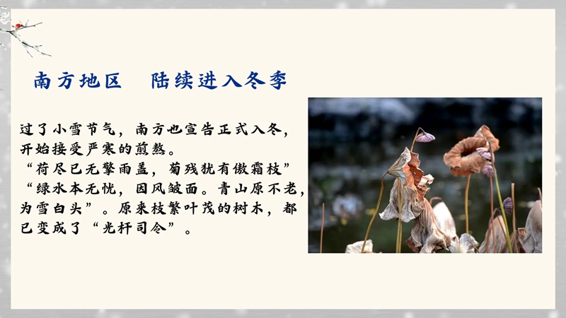 小雪节气,我国北方地区已然开启冬季模式,迎来初雪,南方仍是一幅色彩斑斓的深秋图景。