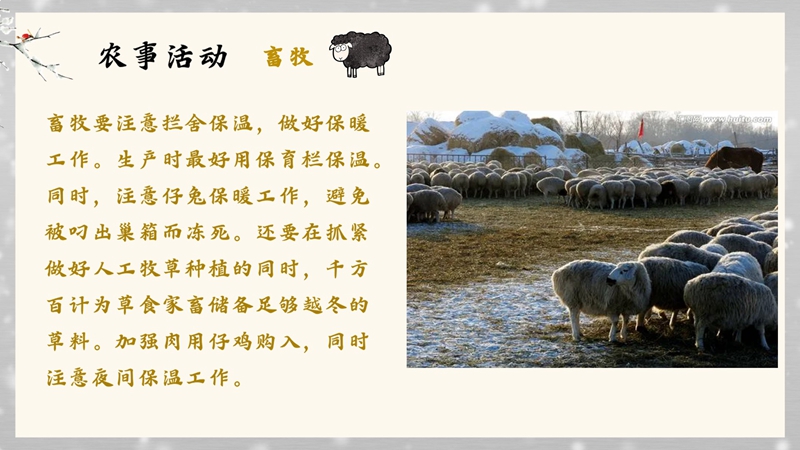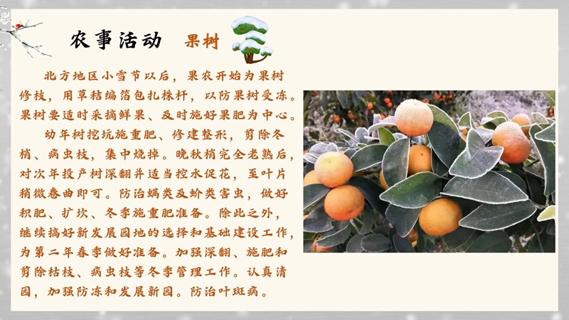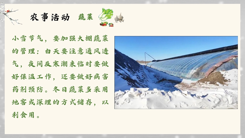 小雪的到来说明各地气温变化又进入另一个节点了,各种农业生活生产都离不开天气。冬日要注意加强大棚蔬菜的管理,以防果树受冻,开始为果树修枝、“穿衣”;畜牧要注意拦舍保温。