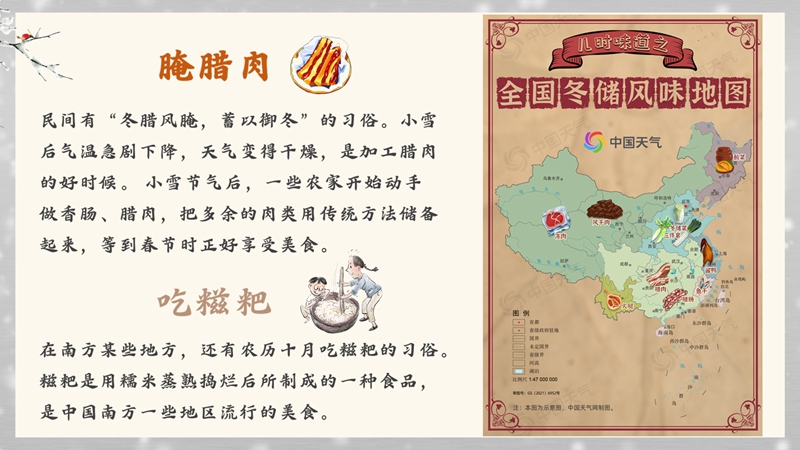 “冬腊风腌,蓄以御冬”。小雪之后,气温骤降,空气干燥,是腌菜、腌肉的好时候。新鲜的食材饱经风吹日晒霜冻,经过时间的沉浸、蜕变,到了岁末年终,便成为餐桌上令人垂涎的一道道美食,抚慰着辛劳了一年的人们。