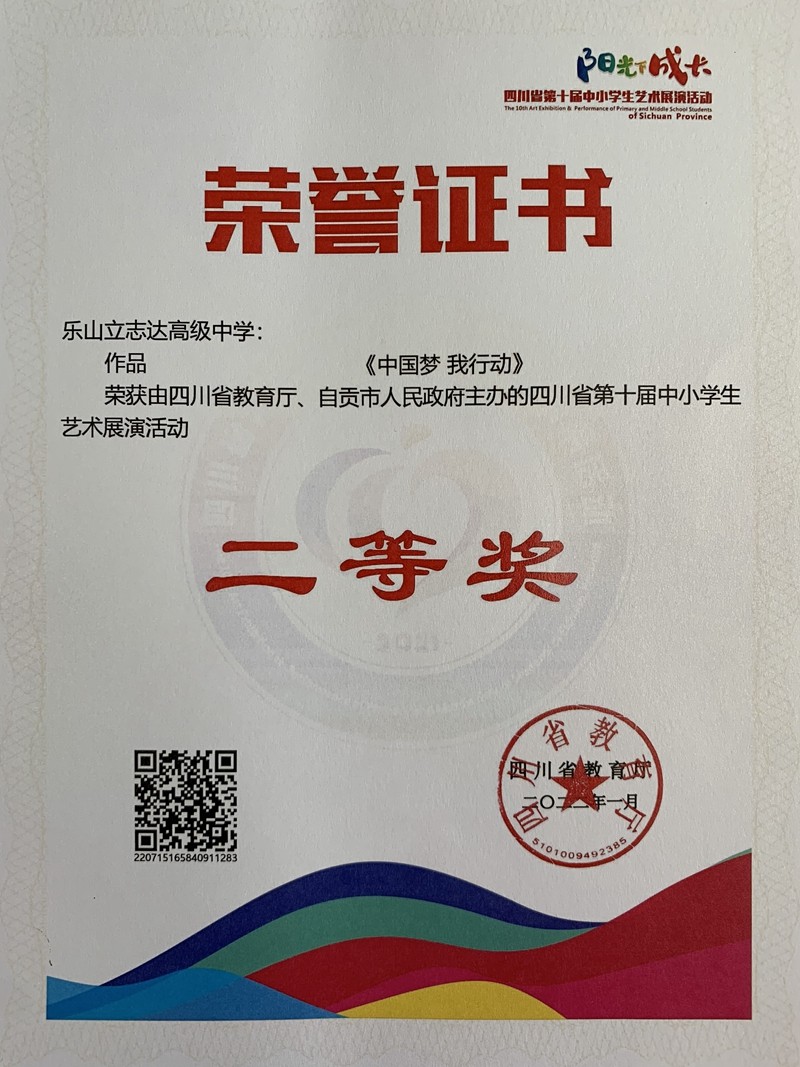 立身以立学为先,立学以读书为本。在日常美育教学中,乐山立志达高级中学特别注重学生的主体意识,以学定教、以生定教、以乐定教,充分激发了学生自主意识和学习兴趣,教师美育创新案例、学生作品在省、市各级美育主题比赛中均获得佳绩。教科研引领美育实践,省、市两级硕果累累,其中,“党史+思政+艺术融合教育模式探究”获省教厅美育创新案例一等奖、立志达高级中学获优秀组织奖;“基于学科特色的高中研创教学模式实践——以美术、地理、化学学科为例”获乐山市教育科研课题阶段性成果二等奖。佳绩沉淀底蕴,底蕴创造佳绩,我校的艺术教育理论和艺术教育实践正向阳而行。