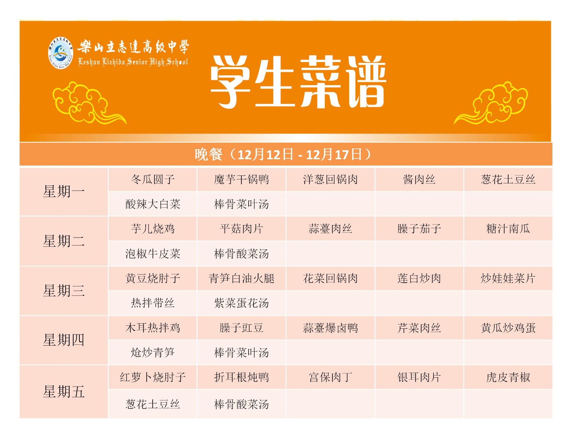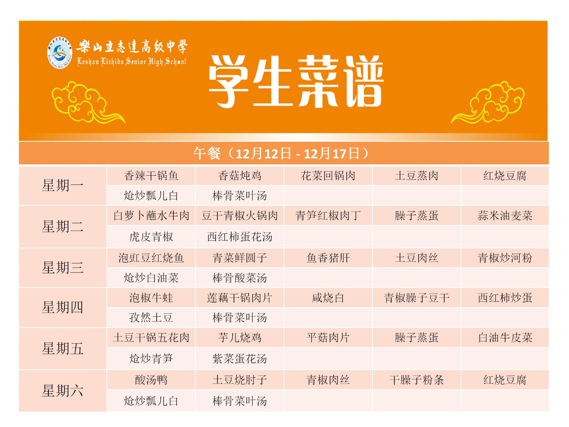 立志达高级中学菜谱(12月12日—12月17日)
