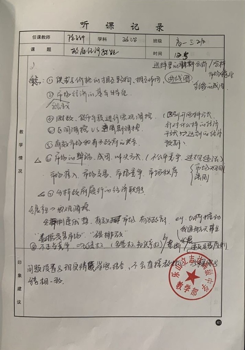 过程中,备课组长亲自督查,检查组教师一丝不苟地严格按照备课、作业批改制度进行审阅。对教师的备课,检查组从态度、学情分析、目标及核心素养剖析、重难点突破方法、教学过程合理性、教后反思等六个方面做出评估。