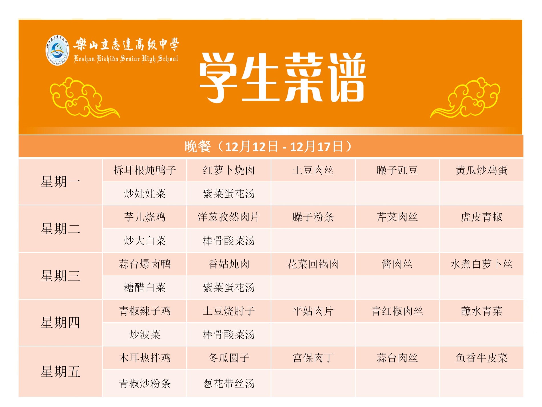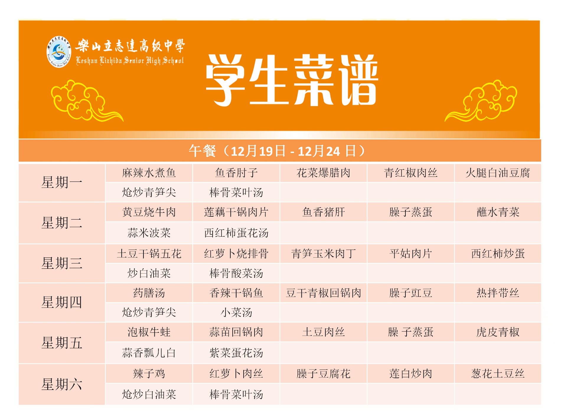 立志达高级中学菜谱(12月19日—12月24日)