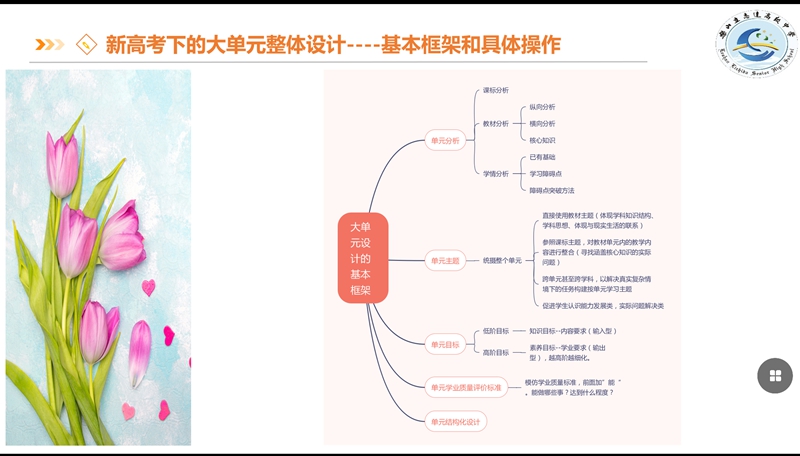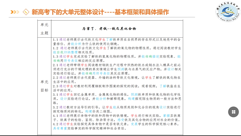 接着,她结合自己设计的《厉害了 老铁》课件和老师们分享具体环节的操作,从课标分析、学情分析、教材分析、单元确定、单元主题确定、学习目标书写等方面展开了讲解。徐老师总结到“大单元”的核心是由零散走向关联、由浅表走向深入、由远离生活需要走向实际问题的解决。