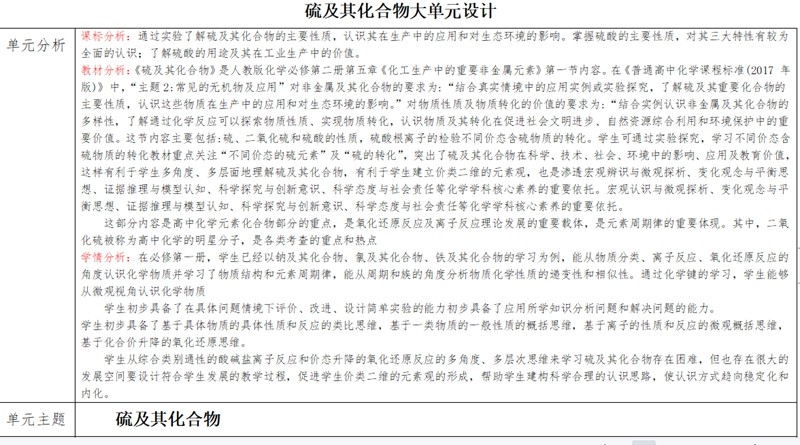 《普通高中化学课程标准(2017版)》颁布,标志着基础教育阶段核心素养本位的教学改革成为主流。核心素养导向下的“大单元教学”设计要求教师建立好学科素养与学科核心内容之间的关系,依据课程标准和教材,指定学习目标、选择学习活动、开展课堂教学,进行学习评价。