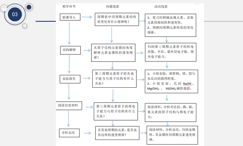 高一化学备课组组长郑孟群老师进行了《大单元教学——同周期元素递变规律》教学设计的分享,她从教学分析、教学设计、教学流程图三方面进行了展开。教学分析基于对课程标准的研读和教材的分析、学情的分析设定了教学目标。教学设计中一共有4个实验验证第三周期金属元素的金属性于非金属元素的非金属性强弱规律。以同主族元素碱金属元素和卤素元素为前提,提出周期表中同周期元素的性质又有什么规律?例如对第三周期金属元素钠镁铝的原子结构递变规律进行性质预测,接着利用金属性强弱的依据,通过钠镁铝分别于水反应置换出氢的难易程度实验,得出结论。使学生形成探究元素性质规律的思维建模:性质预测——结构解释——寻找证据——得出结论。