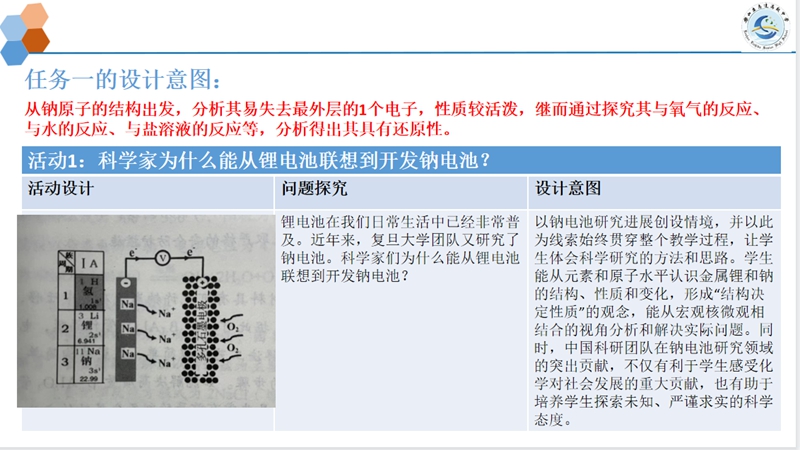 她依托4个任务开展教学活动:①科学家为什么能从锂电池联想到开发钠电池?②钠电池工作时,发生的反应是什么?③钠电池在推广使用上可能有什么局限性?④钠电池可能具有什么优势?整篇设计以钠电池研究进展创设情景,并以此为线索始终贯穿整个教学过程,培养学生体会科学探究的一般过程和方法,从实验探究再到实验结果分析,激发学生学习化学的兴趣。
