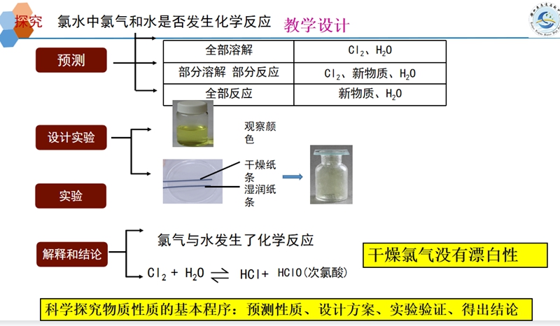 高一陈美霞老师对《氯及其化合物》进行了单元分析,结合教材和学情分析,设定了单元目标。以氯的发现史为情景,让学生学习科学家的研究精神既勤于钻研、严谨求实的科学态度。任务设计以氯气的制法和性质、探究氯水的漂白原理和84消毒液的制备和使用为中心。例如在《探究氯水的漂白原理》课时中,以法国科学家贝托莱的研究为情景导入,设定探究性实验《氯水中氯气和水是否发生化学反应》,引导学生科学探究物质性质。再结合科学史话和教材,让学生归纳总结出次氯酸的性质,并预测氯水中存在哪些微粒,设计实验方案验证预测,最终得出结论。
